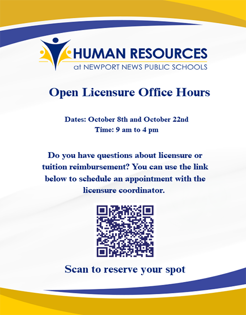 If you have questions about licensure and tuition reimbursement, please email Tanya Andreas, Coordinator of Teacher Credentialing, or call (757) 881-5061 x.11125.